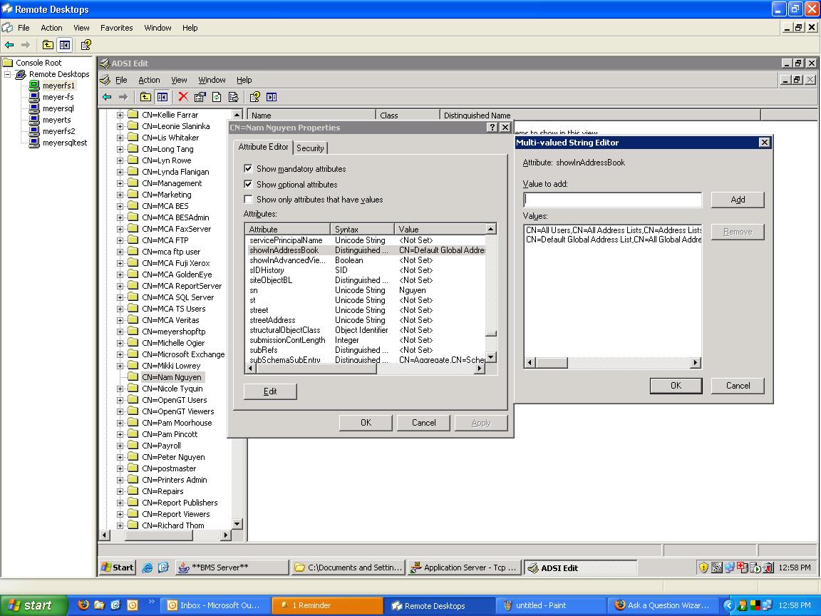 Hi, refer back to my previous questions "cannot create mailbox", I have tried a different approach using adsiedit.msc tool to manually put the values for ShowInAddressBook attribute. I checked the values for the CN that works and copied exactly across to the CN that didn't work. This time i get this error message "The name reference is invalid". Please help!