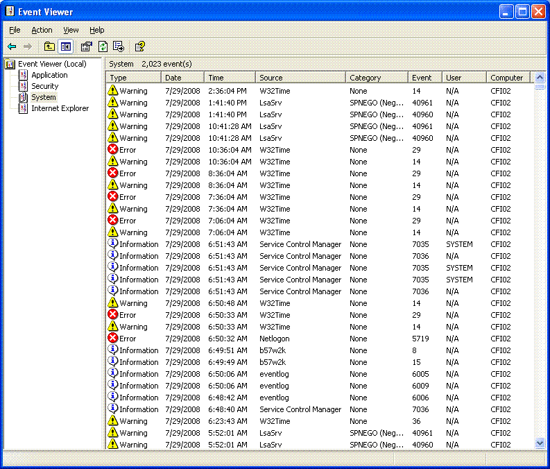 Error      7/25/2008      7:05:25 AM      W32Time      None      29      N/A      CFI02