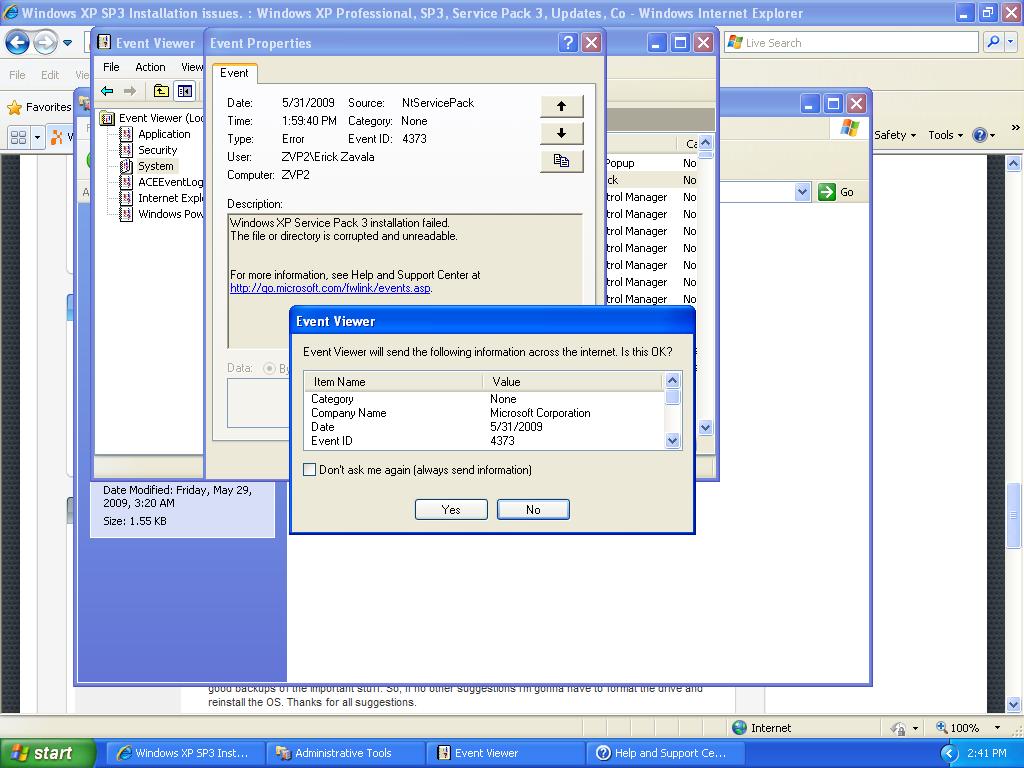 It all started when my system crashed after installing and running HULU. I have searched everywhere for similar errors but i cannot find anything. Â I started Hulu app. and was watching a tv episode when all of a sudden bluescreen apeard. I cannot remember the error it gave me. after that i had to restart the computer. after the Windows Splash screen it just kept restarting the computer over and over again. I coudn't even go into safemode to try uninstall the hulu ap. so id decided to do a repair install with my windows xp cd and did the whole process. Also after successfully logging into windows i also try to update using the windows update icon and it wouldn't install updates so i did a reregistration of the Wups2.dll and i was able to install all updates for SP2 but now when trying to install service pack 3 it gives me the following error: Service Pack 3 Setup Error : "The File or directory is corrupted and ureadable" then it just gives me the option to press okay. I have tried the manual installation which gives me the same error. Â Any ideas?