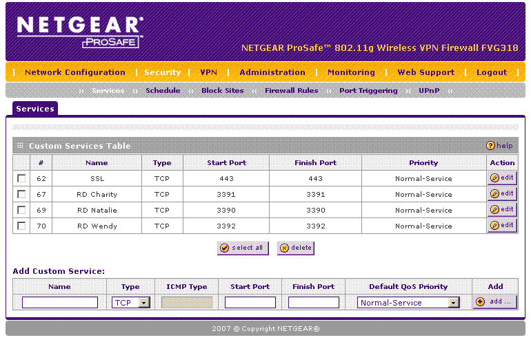 I have setup three services in the firewall area of the router. These are configured for TCP and for the corresponding port that each PC is listening for RD connections on. Example, Ports 3389, 3390, and 3391.