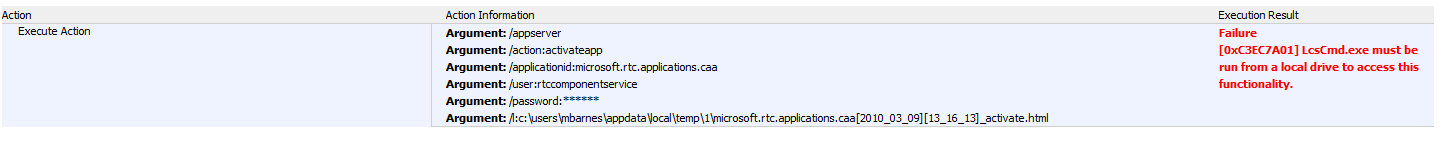 After running Add Server to Pool i get a message that the setup has failed to complete. After viewing the logs I found this error message: "Failure [0xC3EC7A01] LcsCmd.exe must be run from a local drive to access this functionality." I tried searching google and microsoft's site but have not had any luck. The error shows under Activate Conferencing Attendant, Activate Conferencing Announcement Service, Activate Response Group Service, Activate Outside Voice Control.