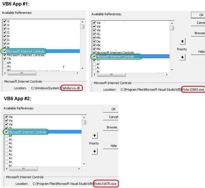 Under "References", App #2 also shows "Microsoft Internet Controls". However, all three references point to a different DLL or OCA. See screenshot