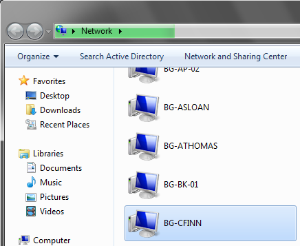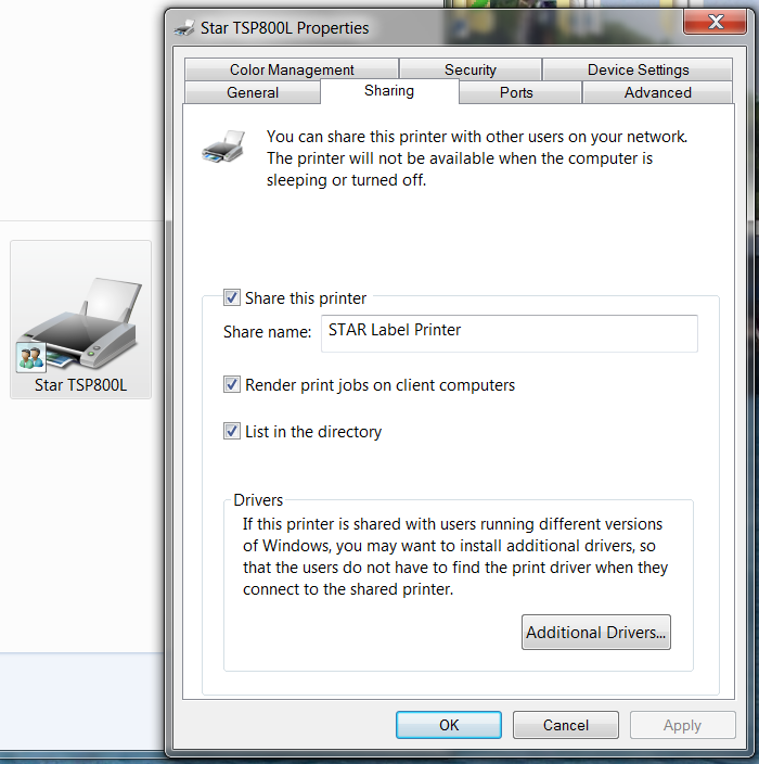 I am having problems setting up printer sharing on Windows 7 in my domain environment. I have been doing my troubleshooting/testing with two computers, both running Windows 7 Pro x86. There is a STAR label printer attached to BG-CFINN via USB. I have setup this printer as a shared printer and listed it in the directory. From BG-MFLOWERS when you try to add the shared printer you get the error message that "Windows couldn't connect to the printer. Check the printer name and try again. If this is a network printer, make sure that the printer is turned on, and that the printer address is correct."
