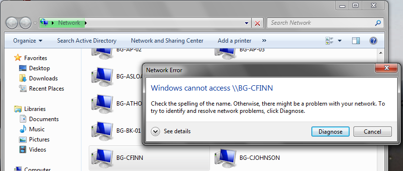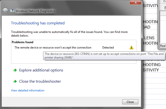 Created a standard file share on BG-CFinn, but could not connect to it either. When you run the connection diagnostics you get the following error: "The device or resource (BG-CFinn) is not set up to accept connections on port 'The File and printer sharing (SMB)'."