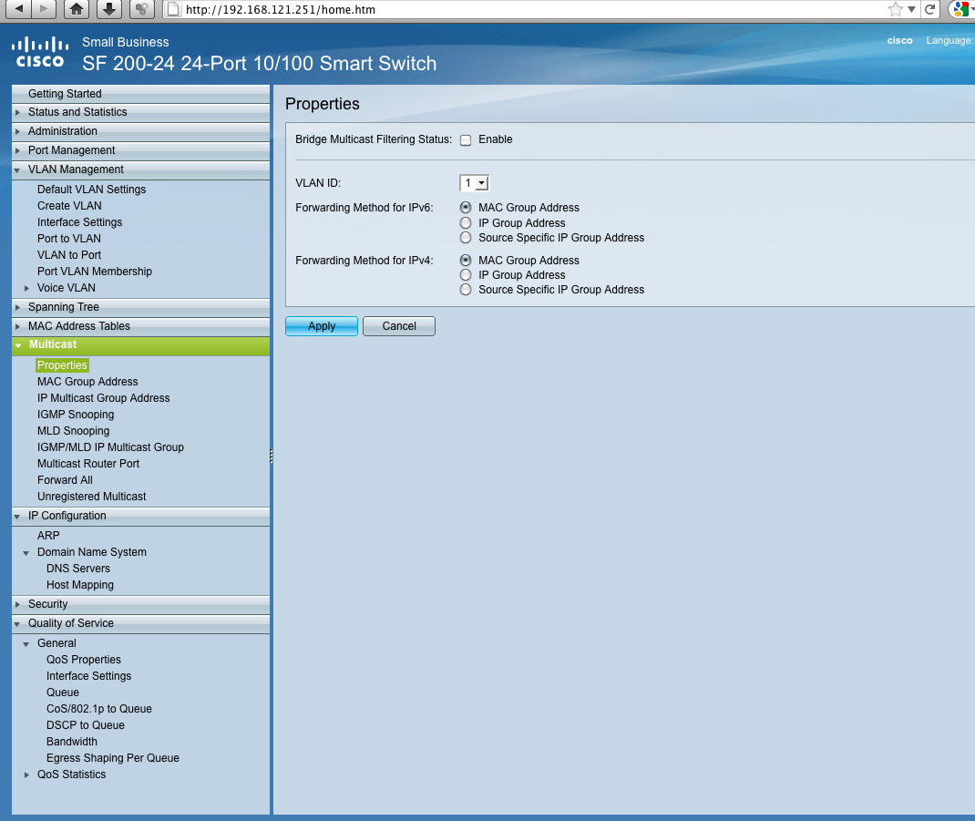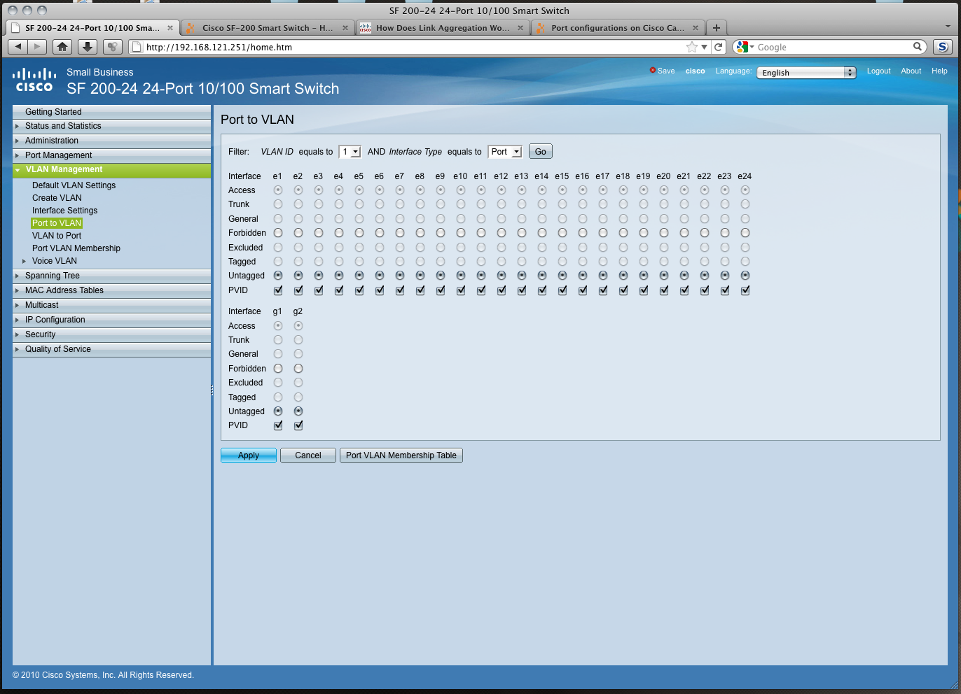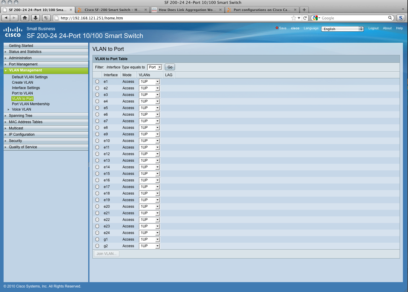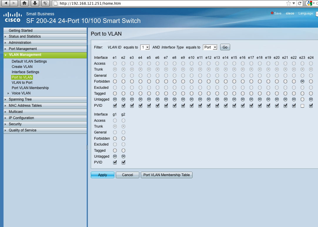 This is my first time using a entry level Cisco Switch. This is a SF 200-24 model. I have attached a screenshot of the WebGUI and the administrative guide. I would appreciate someone to help me in setting up a VLAN. I could even give someone VNC access if they need it... or TeamViewer, but would prefer working through here.