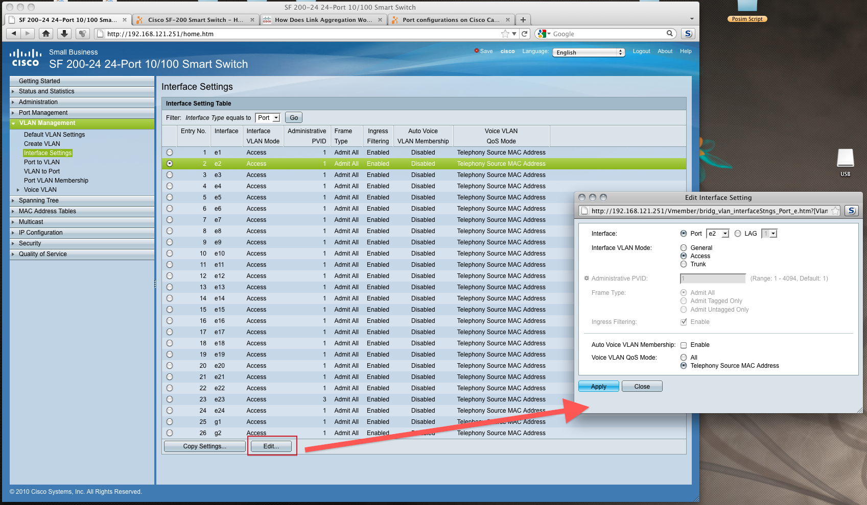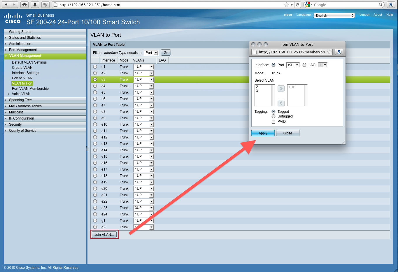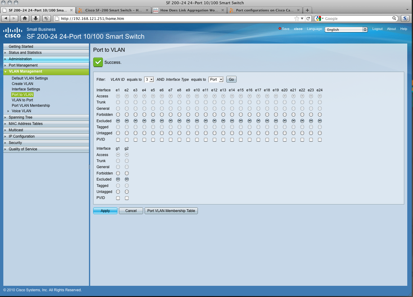 This is my first time using a entry level Cisco Switch. This is a SF 200-24 model. I have attached a screenshot of the WebGUI and the administrative guide. I would appreciate someone to help me in setting up a VLAN. I could even give someone VNC access if they need it... or TeamViewer, but would prefer working through here.