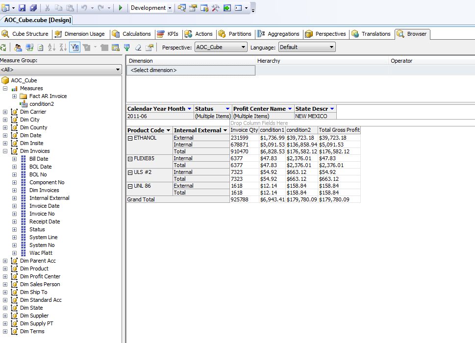 case when [Dim Invoices].[Internal External].currentmember Is [Dim Invoices].[Internal External].&[Internal] Then [Measures].[Invoice Qty] * 0.0075 Else ([Measures].[Total Revenue] - [Measures].[COGS] + [Measures].[Supplier Discount] +[Measures].[Total BLND Credit] + [Measures].[Supplier Rebates] + [Measures].[TVA] - [Measures].[Marathon Promotional Fund Fee]) End
