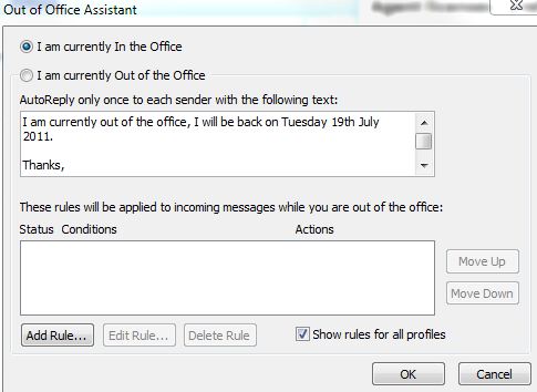 In Outlook 2007 go to Tools -> Out of Office Assistant and then write your message. Then tick the I am currently Out of the Office box and you are done. Just remember to turn it off afterwards :)