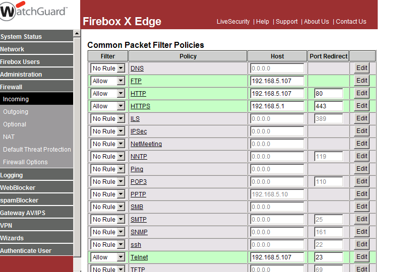 Initially I had created a custom packet filter policy with the 3 necessary ports included 21, 23 and 80. But the logs showed that incoming traffic to these ports was being blocked.