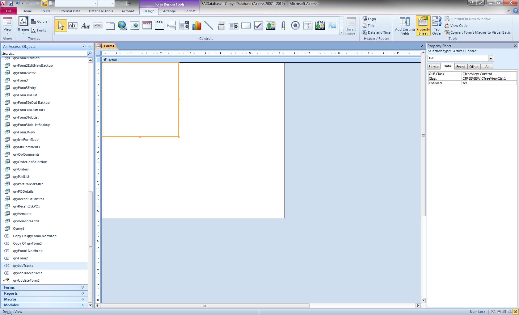 fyed; I went through the episodes.. I focused on the actually structure of creating the tree. I managed to get two tiers setup.. The first is my Job Number which comes from a query, qryJobNums where I have the criteria set to Eval("[Forms]![frmFAI]![cb