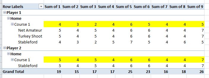 Pivot Table - seems to properly append correctly if more players/courses are added; however, their respective Min rows are not highlighted.