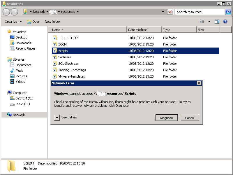 The problem is on one server running Windows 2008 and accessing one namespace. Three other namespaces work fine. The namespaces work fine on other servers and clients.