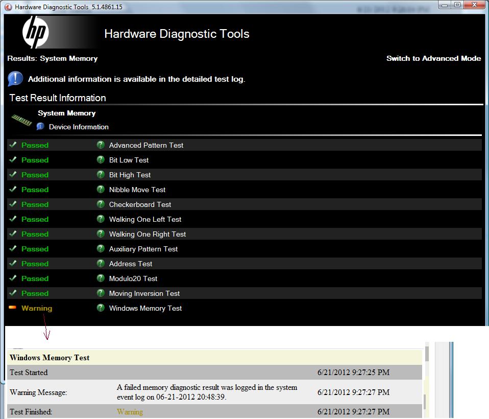 The HP memory test also looked good after installing the 2 GB stick, only 1 warning.