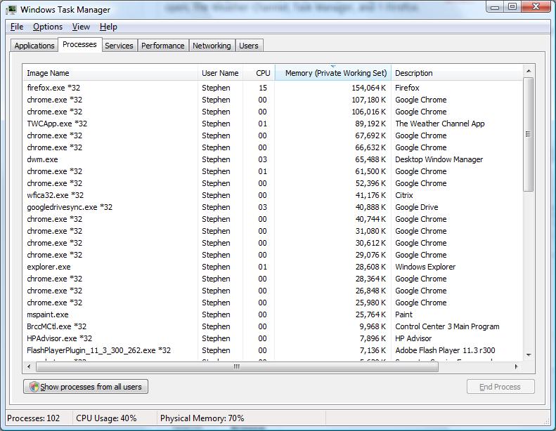 But memory gets eaten up very quickly . . . right now I have 3 google chrome windows open, The Weather Channel, Task Manager, and 1 Firefox.