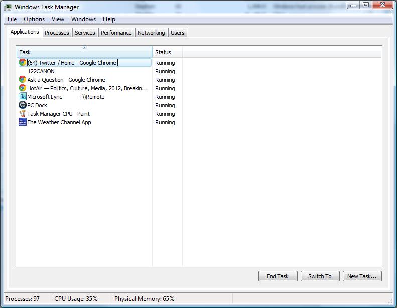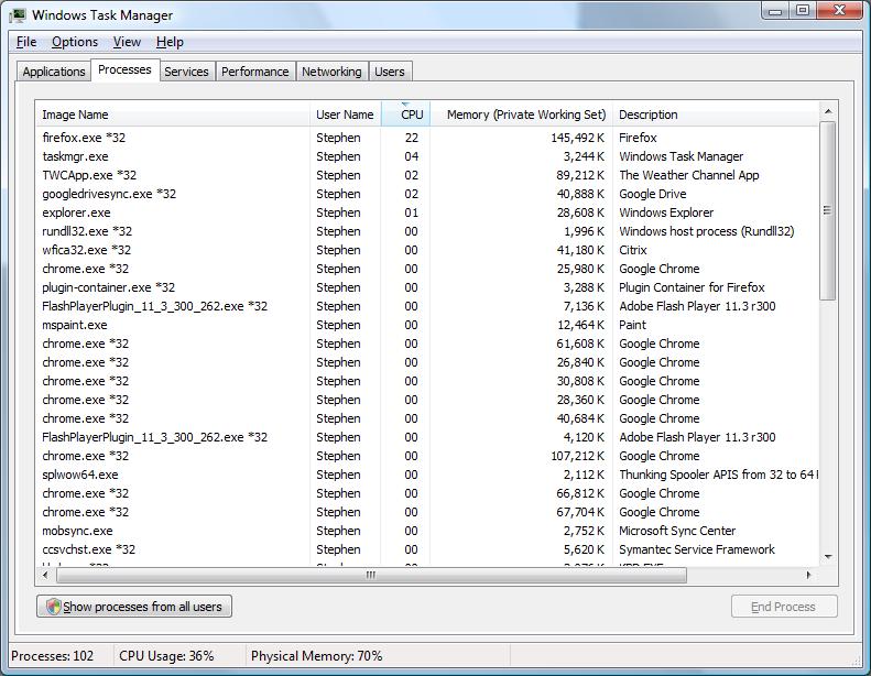 CPU is~20%, but Physical Memory is ~70% . . . at work I have 20+ windows open, but at home it's slowing down after 5 or 6, and I usually have 5 FF, 5 Chrome, and others.