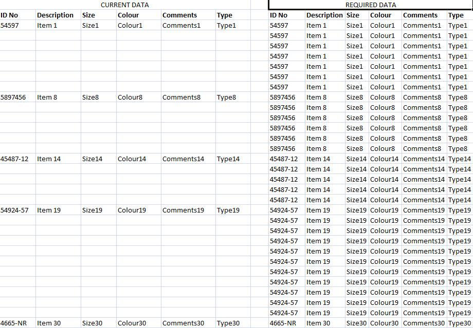 I need a macro to copy Row1 columns A to F, and then paste the data in rows 2 to 5 (the next product on the list which is in Row6) - the macro then needs to continue that process until there are no products left.