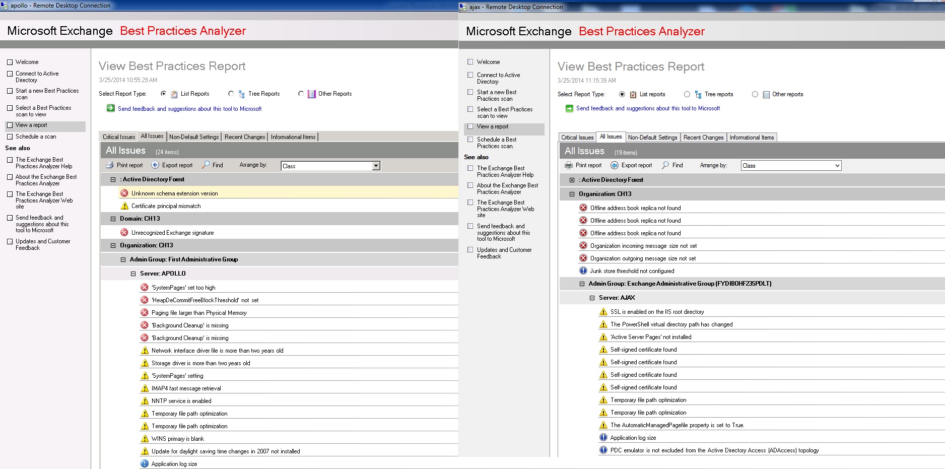 I attached a screen shot of the BPA results for each Exchange server. Left side (Apollo) is the exchange 2003 server, right side (Ajax) is for exchange 2010. I also attached ESM for Apollo.