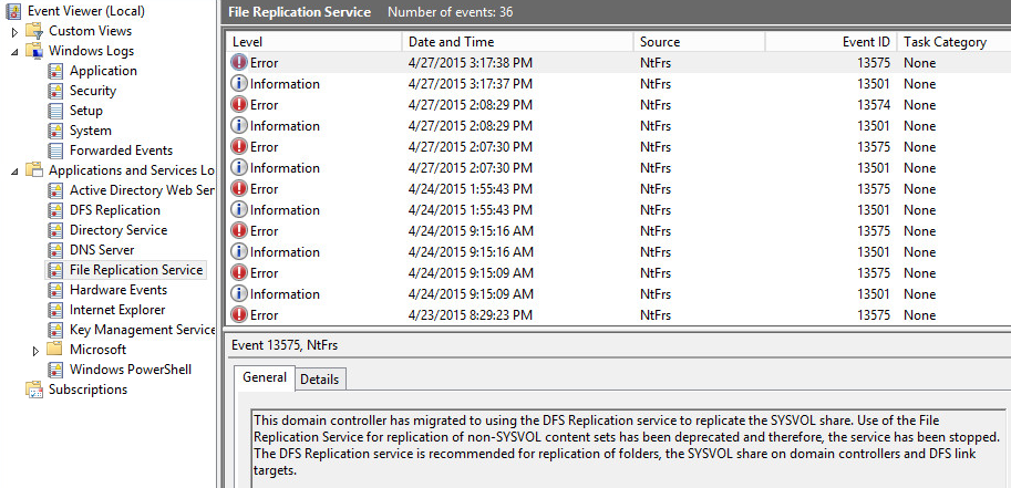 - The NTFRS (File Replication) service will NOT start from the GUI or command line.
