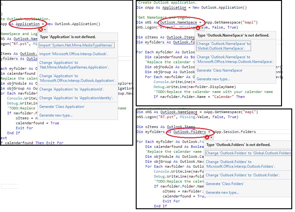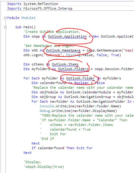 Dim oCalendar As Outlook.MAPIFolder = oNS.GetDefaultFolder(Outlook.OlDefaultFolders.olFolderCalendar)