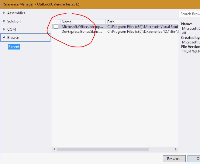 went into "add reference", went to folder "C:\Program Files (x86)\Microsoft Visual Studio 11.0\Visual Studio Tools for Office\PIA\Office14"