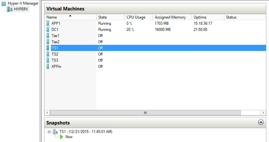 I did not create snapshots by myself but I remember APP1 and TS1 frozen, so I had to turn off these VMs in Hyper-V Manager and turn it back on once or twice.