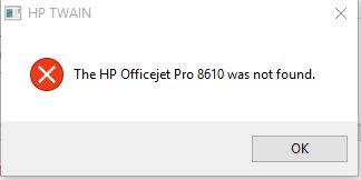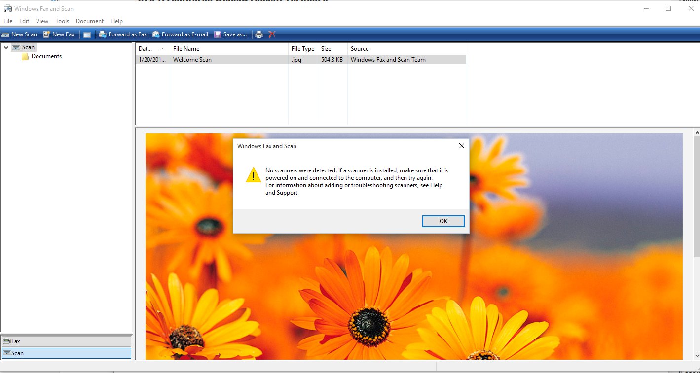Today I tried to scan. Of course, it was very difficult to figure out how to even try that. I got to All Apps, Windows Accessories, Windows Fax & Scan. Did that, clicked new scan (see attached, upper left), I get the error message.