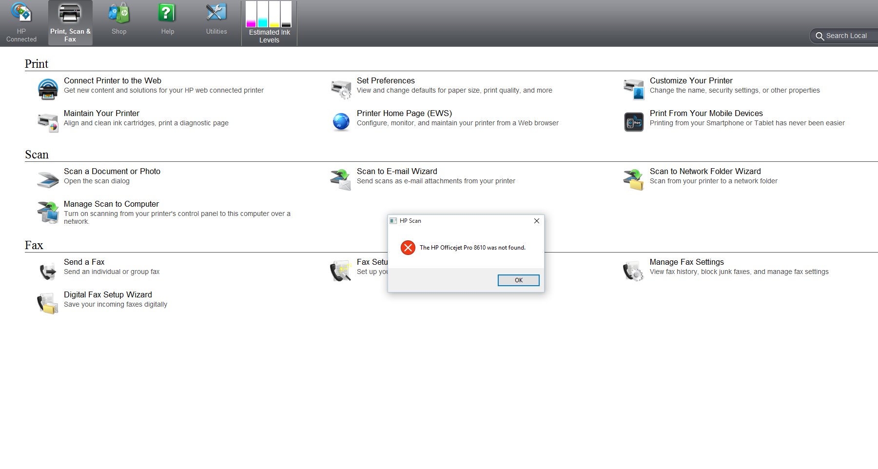 Somehow found HP Scan & Print Doctor (or something like that) on line, went to that, downloaded a bunch of stuff it said to download, same result,