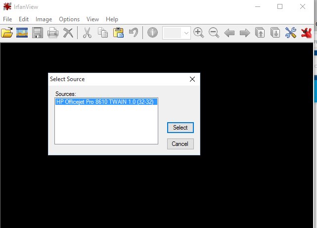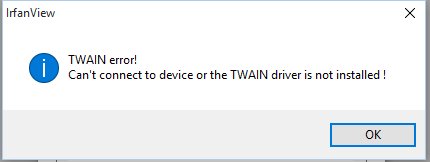 That's good news! You have a TWAIN driver for the device that IrfanView recognizes. Try to scan with it by clicking the File menu, then Acquire/Batch Scanning.... Can you scan with IrfanView?