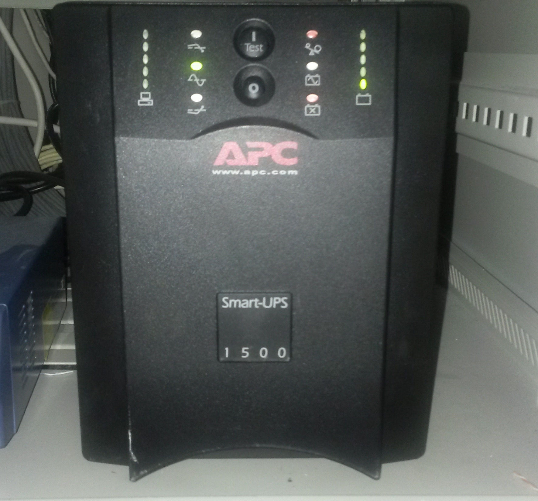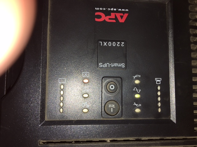 When i inserted the batteries on the weekend, the APC once powered up was emitting a beep once a minute. I suspected this was because the batteries where not fully charge or the previous fault still existed. Ive since had someone on site check the device for any audio warnings and also to take another picture of the front panel and it seems things have changed for the better. The only led which is red now is the bottom right battery LED which might suggest one of the batteries are not plugged in correctly. All other lights are showing green so I think we might be gettting somewhere?