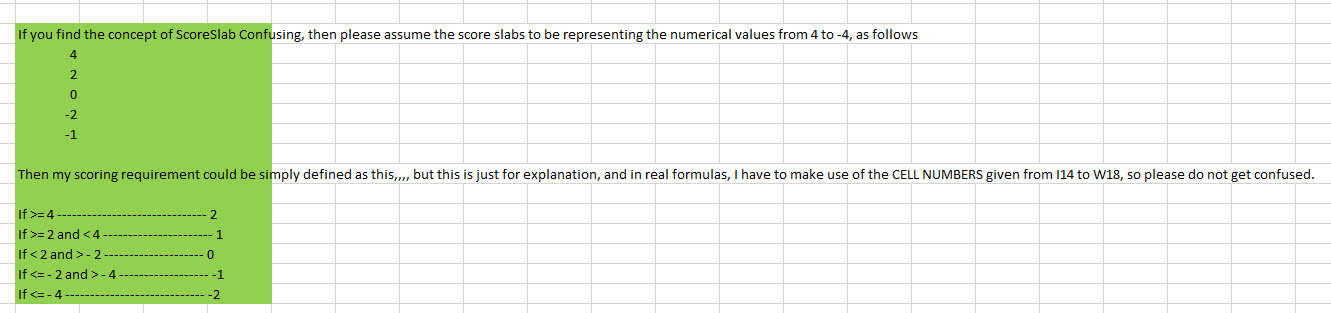 I have a data set in excel, in which I have to give scores based on this criteria defined in 5 different ScoreSlabs. Please look at the excel sheet, that will clarify it instantly.