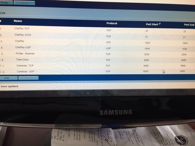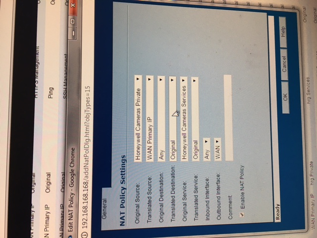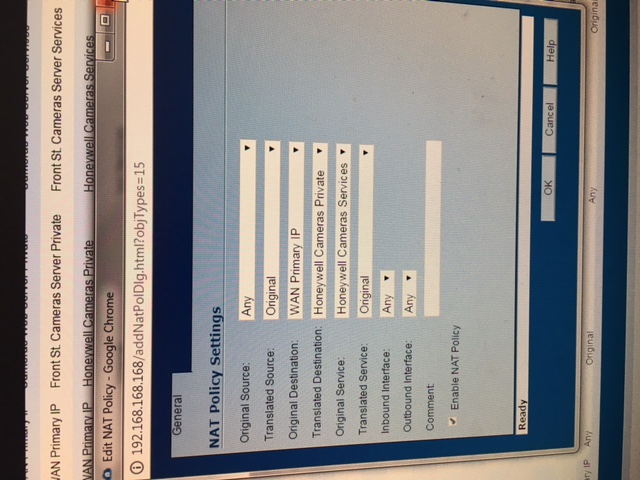 I called our ISP and asked about closed ports. Â They informed me that they don't close ports. Â They also said that having 2 static IPs shouldn't cause a problem. Â I'm pretty lost here. Â We have the same router at a different location and forwarding ports for security cameras was never a problem. Â I attached snapshots of the NAT Policy Settings, Address Object Settings, and the Services settings for port 8000.