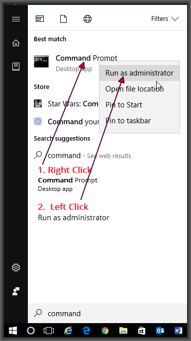 Go to the Search button, type in cmd.exe and at the top you see Command Prompt. Right Click on that and select Run as Administrator. Good luck.