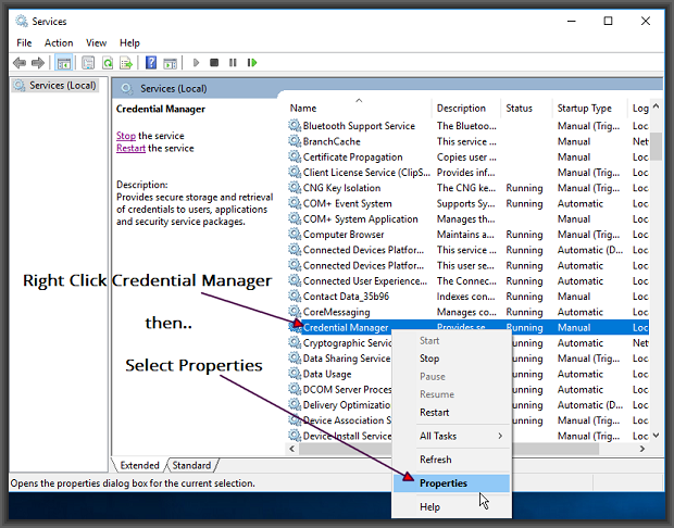 Steps 2. Â In the Services window, right click Credential Manager service and then select Properties as shown below