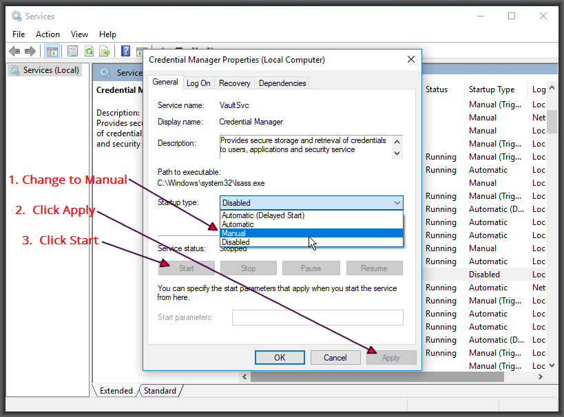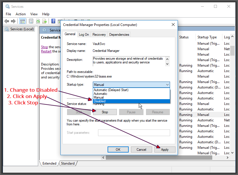 Steps 3. Â Change the Credential Manager service to Disabled, then click Apply, then click Stop to stop the service. Â