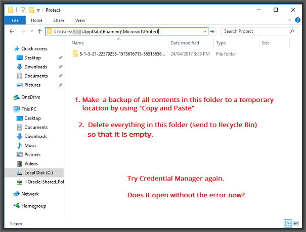 If you are still getting the same error after completing the above steps, then the following process "should" definitely fix it, but you will lose all of your saved credentials in Credential Manager and will need to re-enter them again, either manually or via the browser.