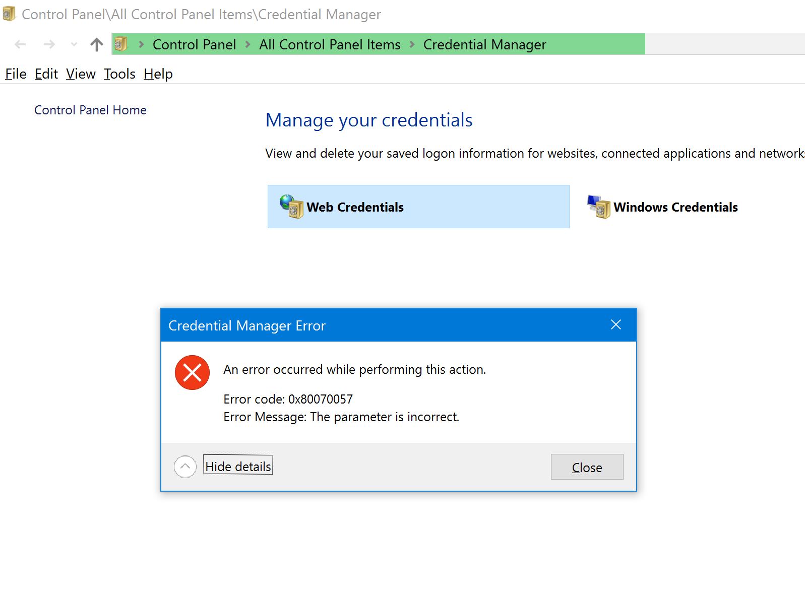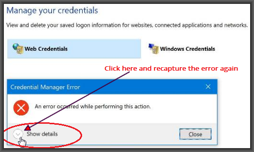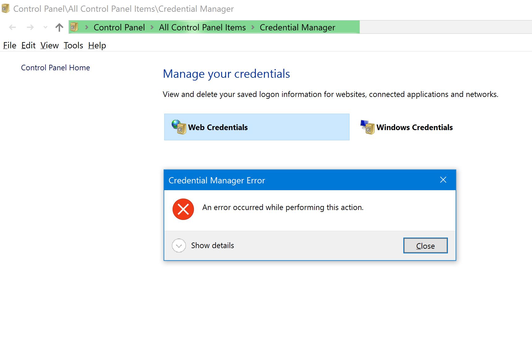When I went to the credentials manager. I got an error message saying error occurred while performing this task and the web credentials were highlighted . I do see windows credentials and able to click on it but the website in question or EE is not listed there.