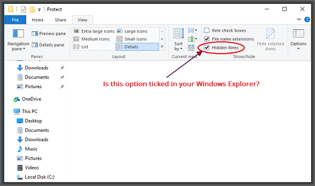 Further to the above, can you confirm that "Hidden items" is ticked to allow you to view hidden files and folders in Windows Explorer? Â