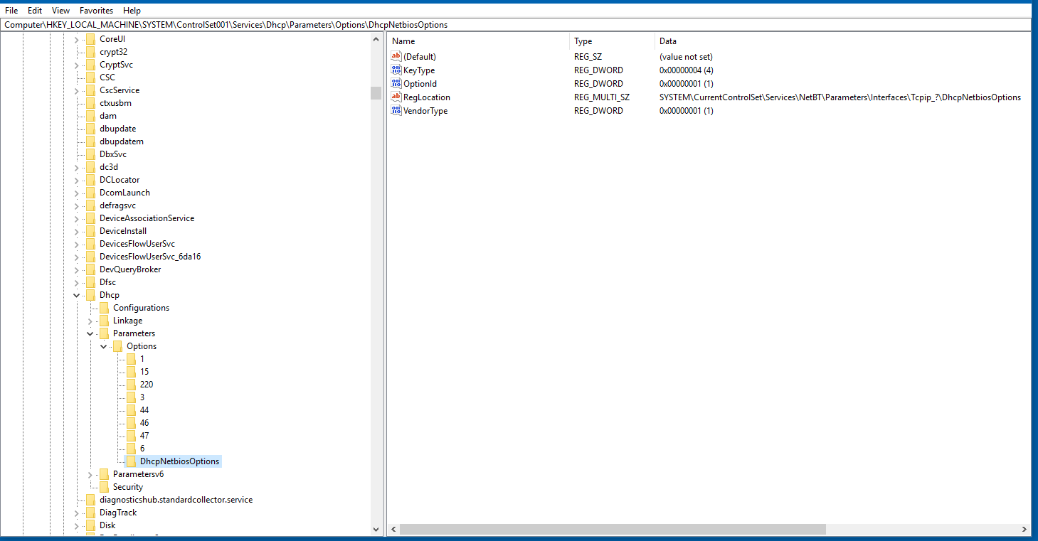 As I had indicated in the original screen caps, all of the NetBIOSoptions had been set to 1 in the currentcontrolset. Â HKLM\SYSTEM\CurrentControl
