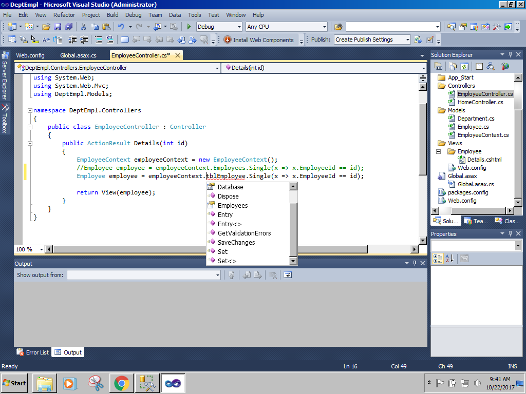 Employee employee = employeeContext.tblEmployees.Single(x => x.EmployeeId == id);