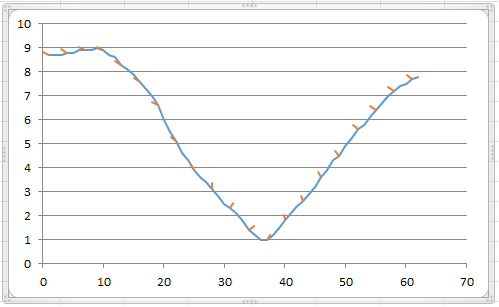 Excel does not have geometrical graphics and the vertical and horizontal scales are always different so a circle would show as an ellipse and a square would show as a rectangle. To overcome this I have the top two cells which play with the vertical and horizontal ratio to make a square look almost a square. You may have to adjust these whenever the data size changes. The third cell is there to show a rectangle which will help you adjust the x and y.
