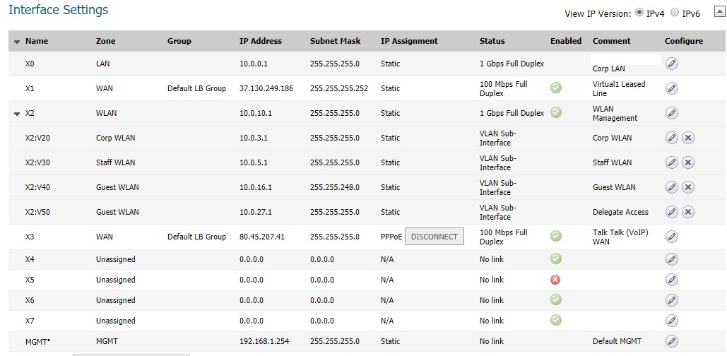 At this site corporate WLAN on X2:V20 is our corporate WIFI with DHCP served from SonicWall with range 10.0.3.xxx to 10.0.3.200