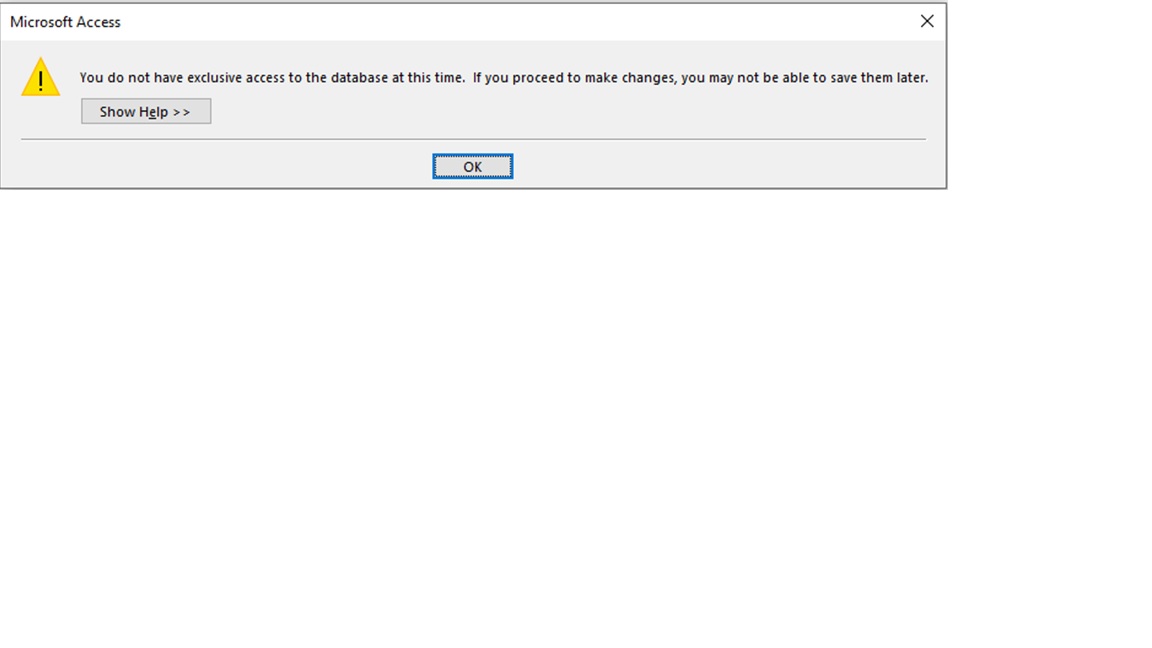 From Access's standpoint, it see's more than one connection to the database, so it says that you do not have exclusive access.