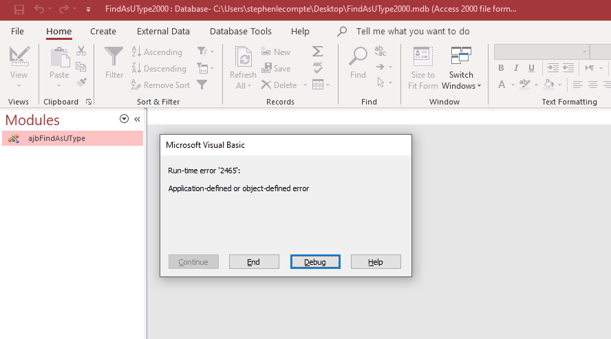 Need help with fixing this old Find as you Type Allen Browne sample database - error: run time error 2465