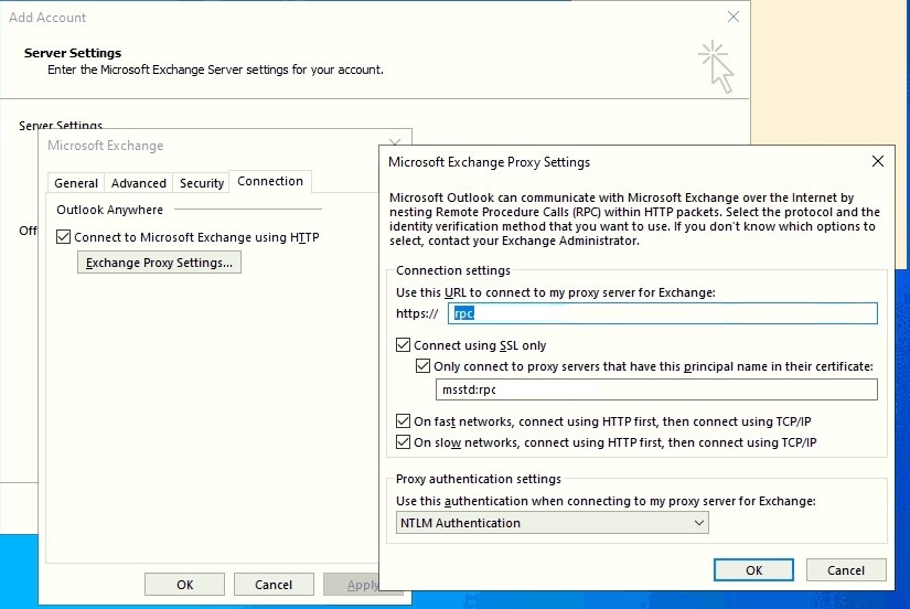 migrated the Exchange server from 2010 to 2016 - issue configuring Outlook