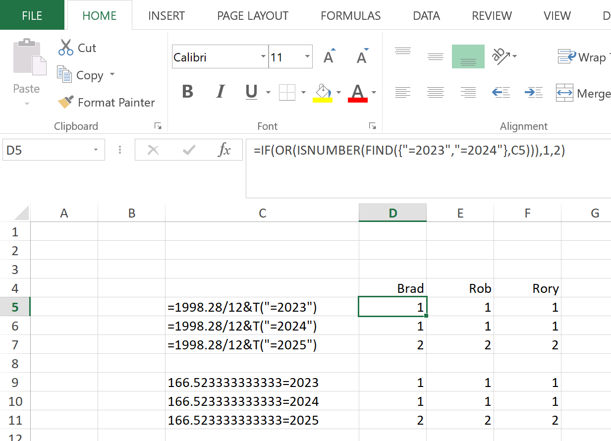 =IF(OR(ISNUMBER(FIND({"=2023","=2024"},C5))),1,2)