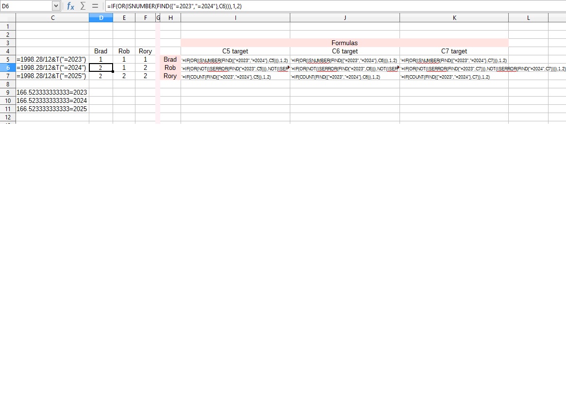Great. I used to programme turnkey spreadsheets in Lotus 1-2-3, Improv and Excel for many years. Of course I also tried to test what I did. But that was 30 years ago, or more. But perhaps the point you are missing on, is that I have a source cell which has both 2023 and 2024 at the same time. That was why, in my original post, the OR function is used. It looks to me like only Rob got that jist . . . I don't know . . . but you can see on this screenshot the results I have coming out of my machine.