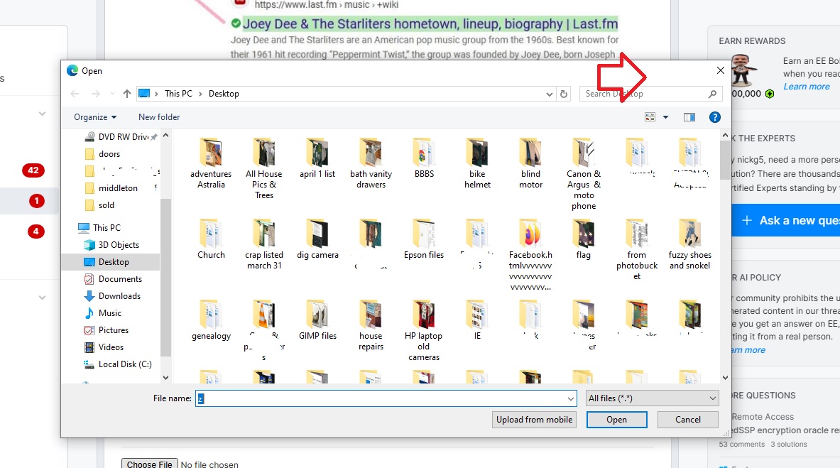If, for example, you were using Chrome previously, log back into EE there and start to upload an image, Chrome should open in the location you always used before and you can use that information to inform the location Edge will use in the future.
